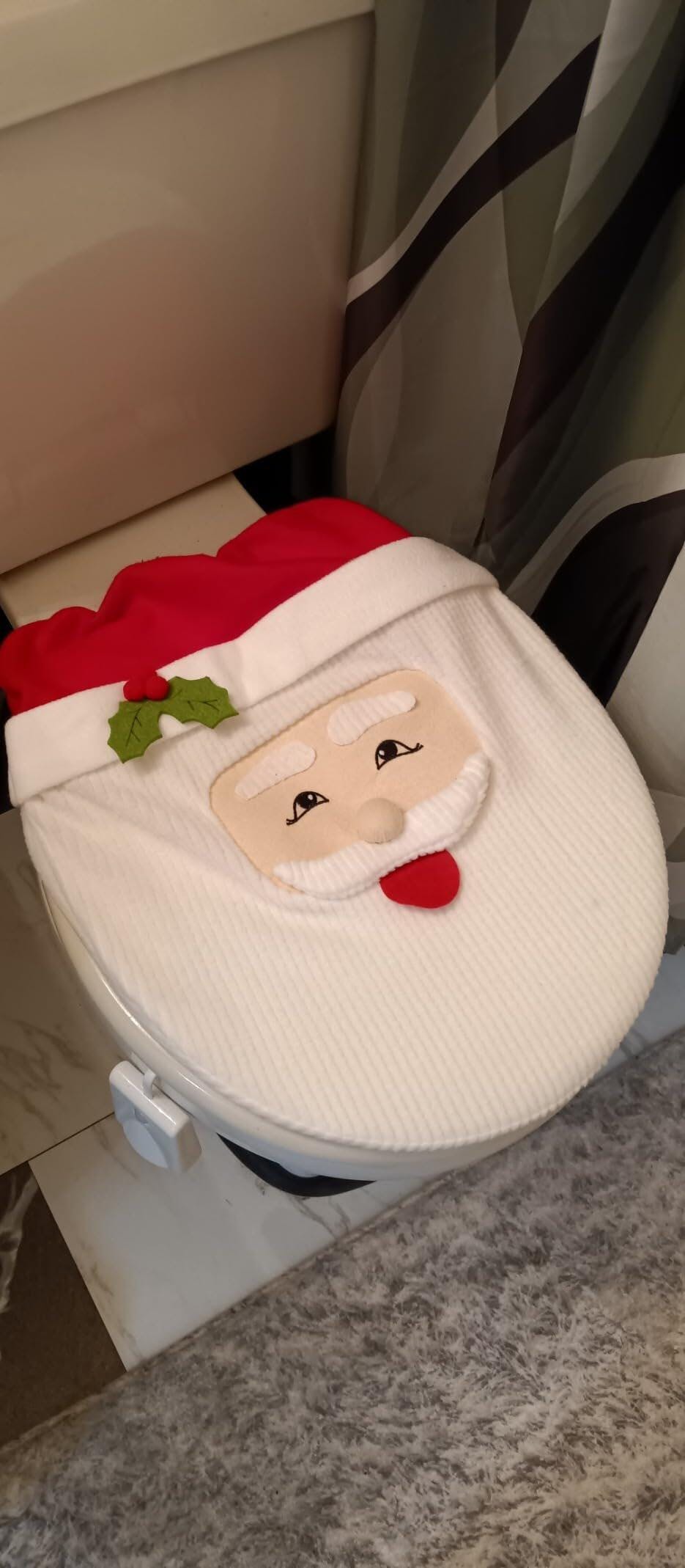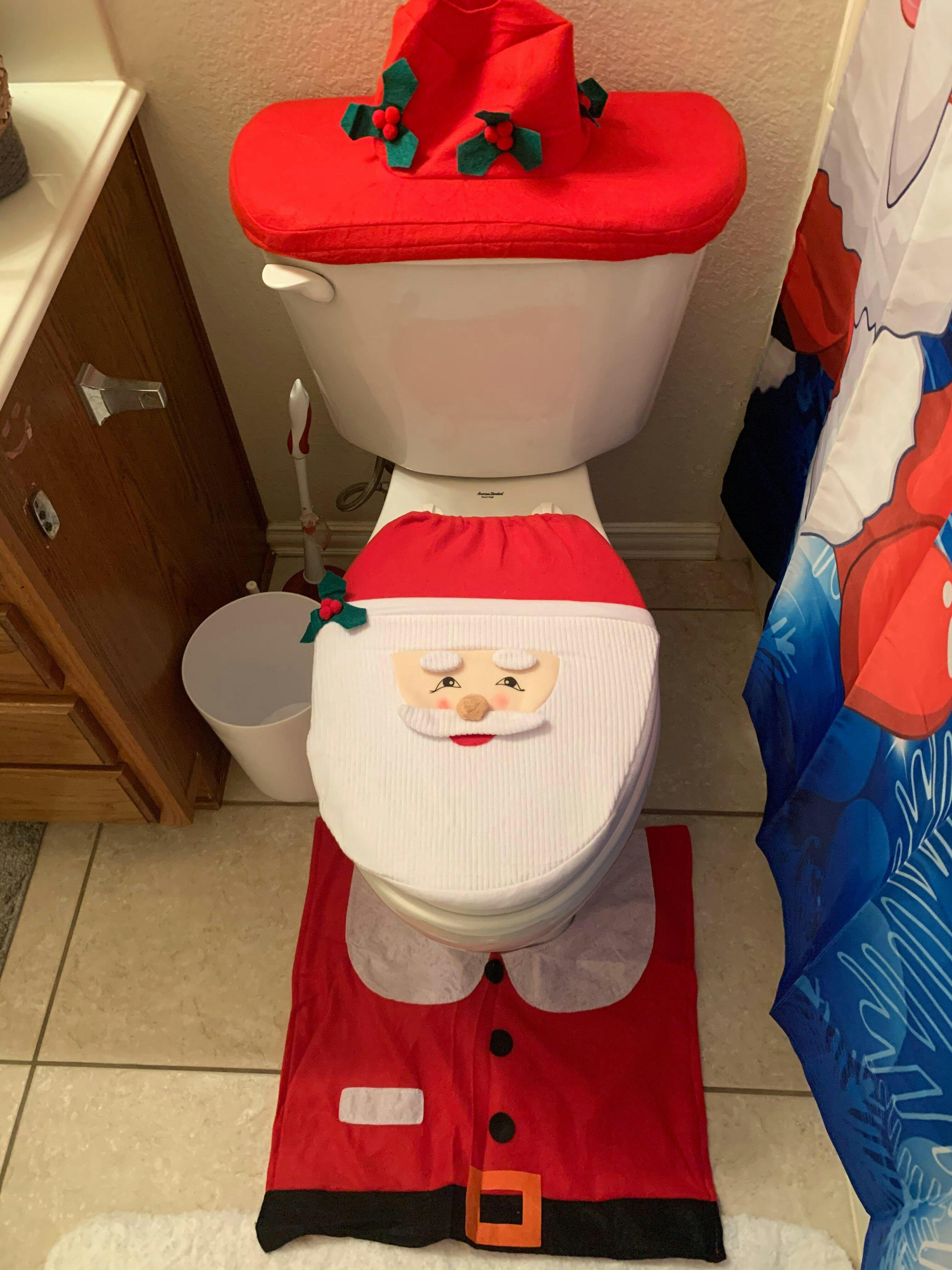 Santa Toilet Seat™ 4-piece handmade set includes a lid cover, tank cover, rug, and tissue box holder. Soft, reusable, and hilariously festive, it’s holiday humor wrapped in cozy fabric.